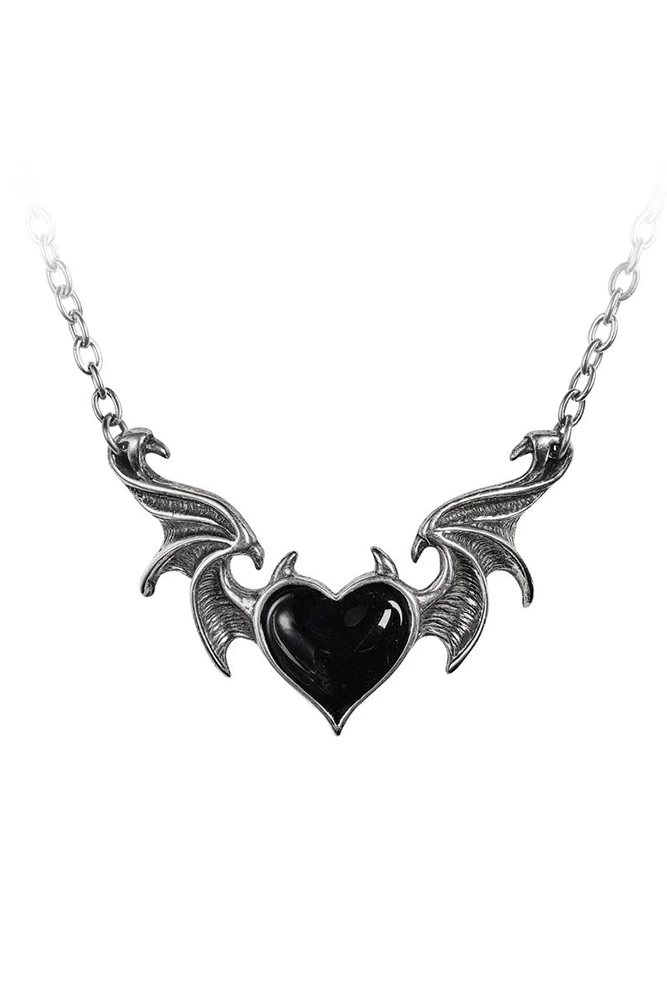 The black demon heart of a gothic seductress, nocturnally enticing her prey with ravishing enchantment. An enameled black heart with horns, between the outstretched flying wings of a demon.