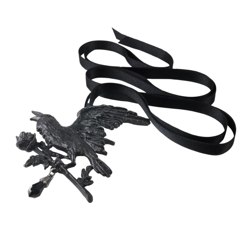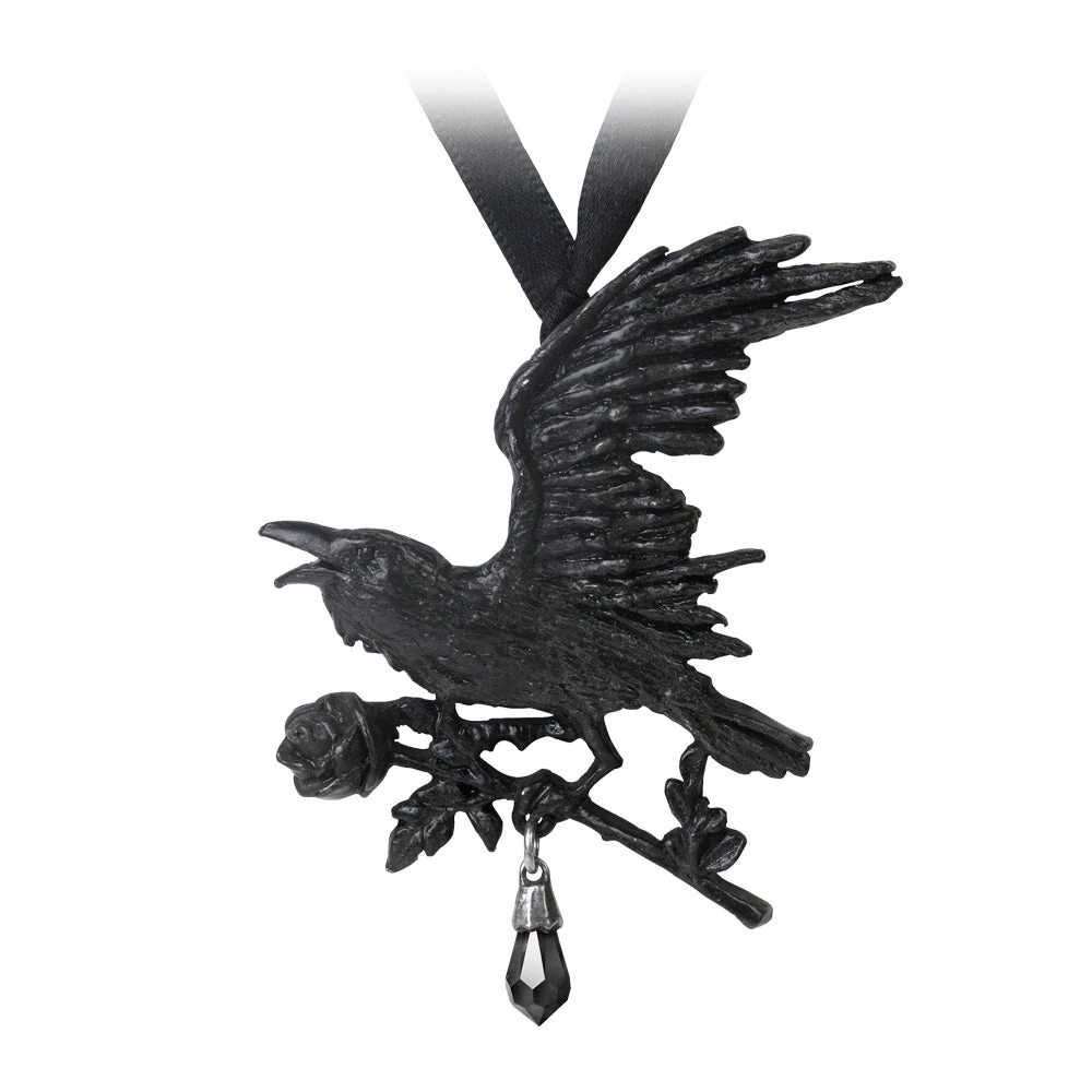 A black pewter profile pendant of a flying raven with a rose in its claws, suspending a black Swarovski crystal dropper with burnished pewter cap.