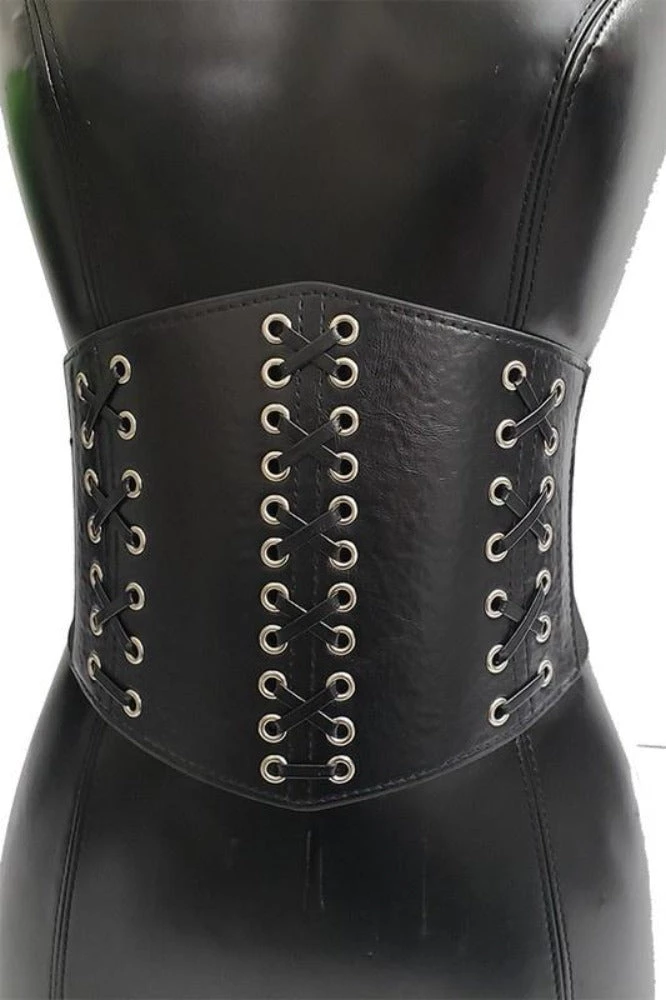 Wide corset, multi tie 3 sides, elastic belt Free size: 27X4.5 30% PU 70% Elastic Made in China
