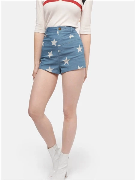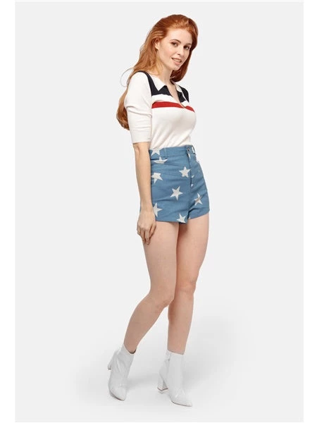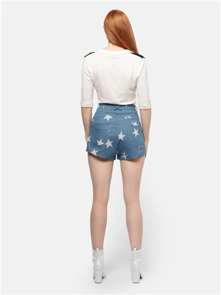 Be part of the ‘club’ and reach for the stars in our sensational Madison Acid Star Shorts. These super high-waisted shorts in acid wash denim have an all-over print of white stars, fasten with a covered front zip and have two patch pockets to the back. Team these with our Mimi Vintage Rainbow Top for an outfit that will make all your dreams come true.