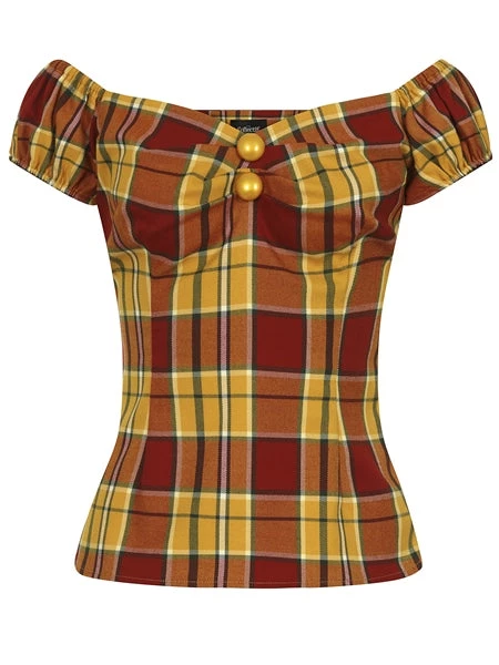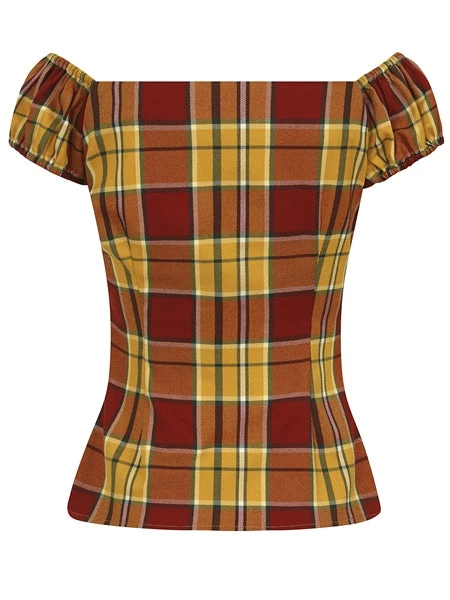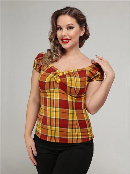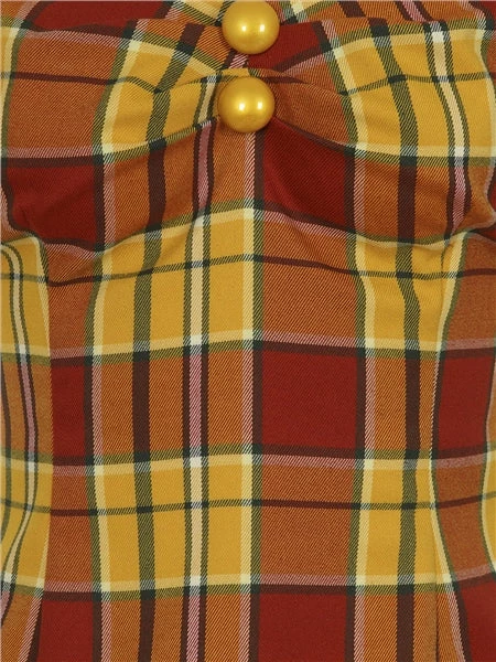 This classic top is now available in this stunning new bespoke print of vibrant red, orange and yellow check with subtle grey and white accents. Our Autumn Leaves Check Top has a sweetheart neckline and a cute pleat detail with decorative domed light orange buttons at the centre of the bust. She’s an upper hip length top, with side seam zip fastening. Try pairing her with one of our black circle skirts a petticoat for something truly dramatic!