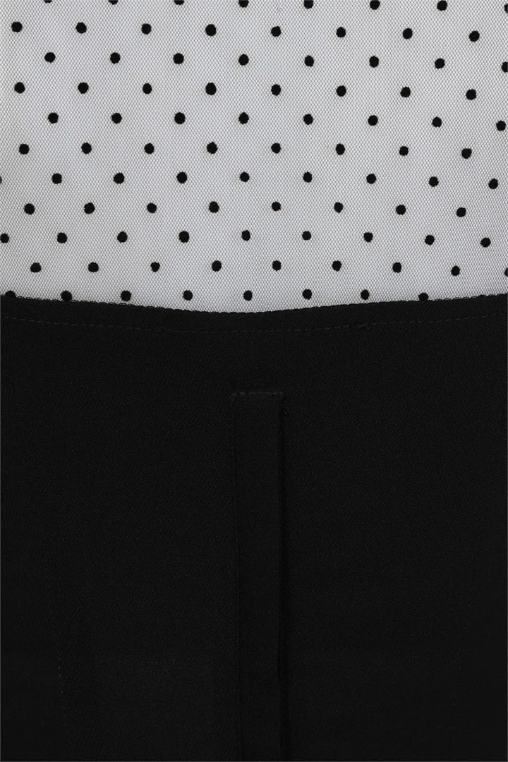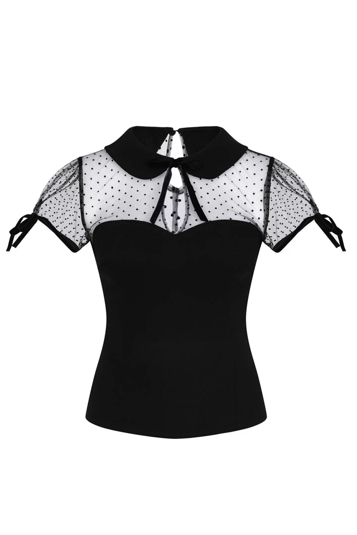 You’re sure to be spotted in our Kitten Polka Dot Mesh Top! She’s the perfect combination of pretty and sassy, with her preppy Peter Pan collar, above a cheeky keyhole at the front, with sweet velvet ribbon bow. The hip-length body of the top has a classic sweetheart neckline, fastens with a center back zip, and she has a keyhole at the center back which fastens with a small black button. Her puffed sleeves are trimmed at the hems with velvet ribbon, which ties into neat bows at the center of the sleeve. Kitten has fun polka dot mesh at the upper chest and sleeves, with her body and collar made from stretchy black bengaline. Pair her with our swing and pencil skirts for a sweet summer look, or wear over a multiple strap bra for an added sassy detail.