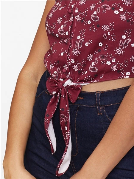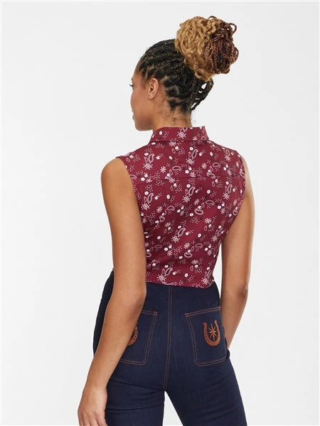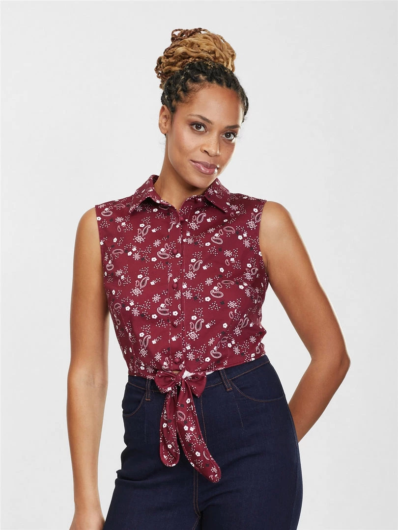 Our Paisley Bandana Tie Blouse is ready to be teamed up with so many options! It’s a sleeveless shirt with a traditional pointed collar, fastens up the front with red button mushroom buttons, and has a waist that is adorned with a tied detail. It is made from cotton sateen fabric in lovely burgundy, and covered in a fun print of a paisley design.Â