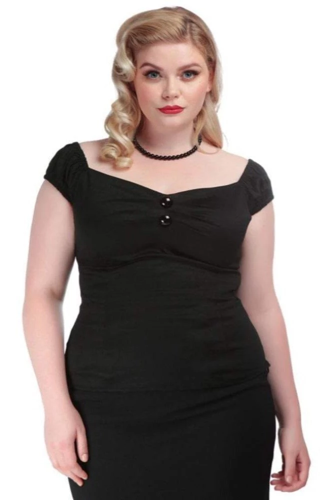 Elasticated puff sleeves with a classic sweetheart neckline and a concealed side zipper. The top features pleating and large domed buttons at the bust that flatter all shapes.
