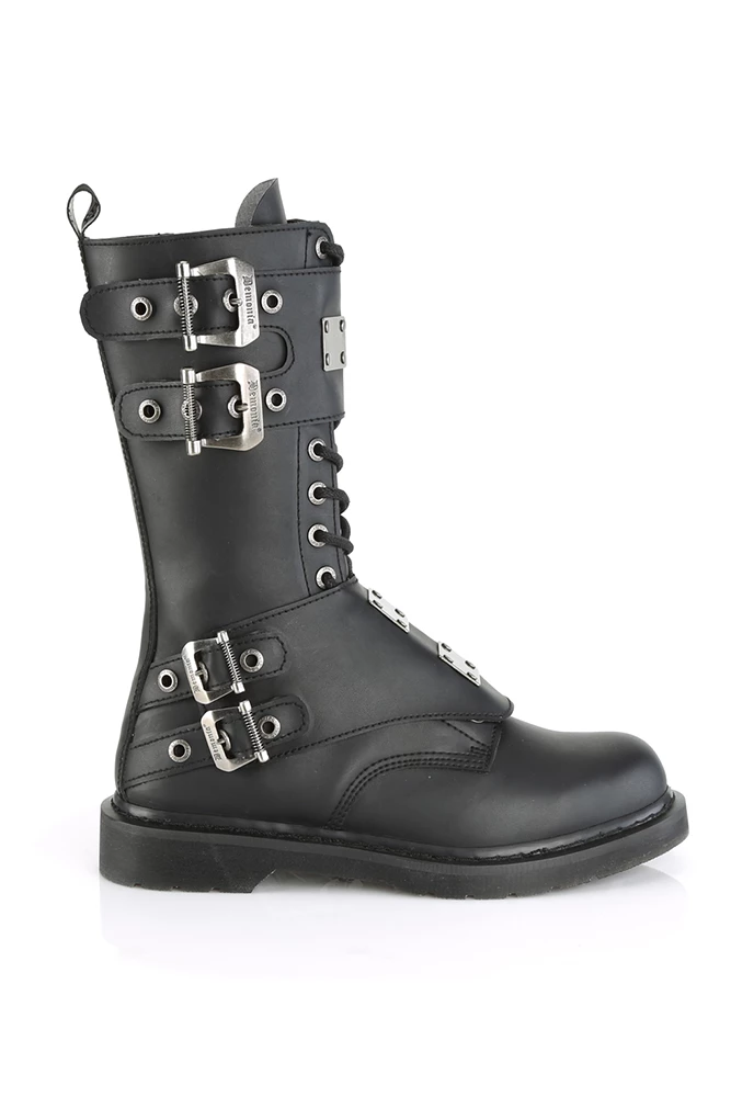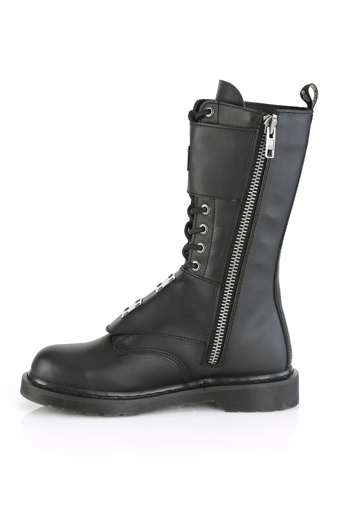 1 1/4″ (32mm) Heel 14 Eyelet Unisex Mid-Calf Combat Boot Featuring Buckled Panels w/ Metal Plate Center, Inside Zip Closure