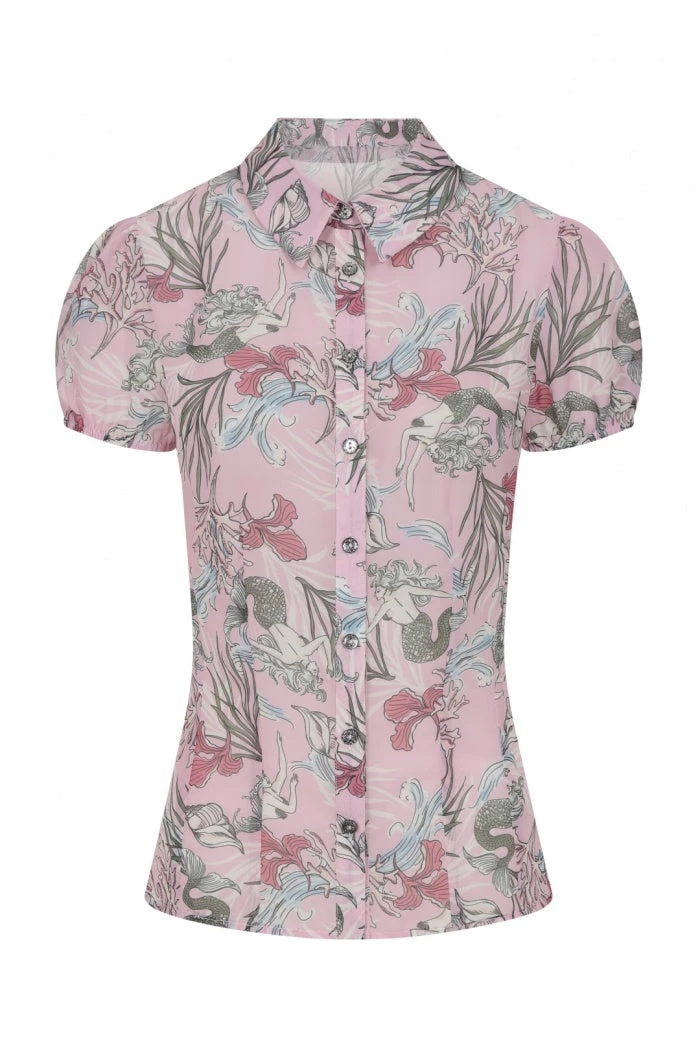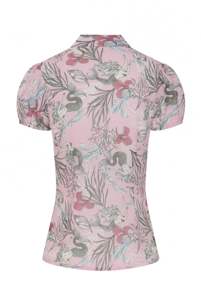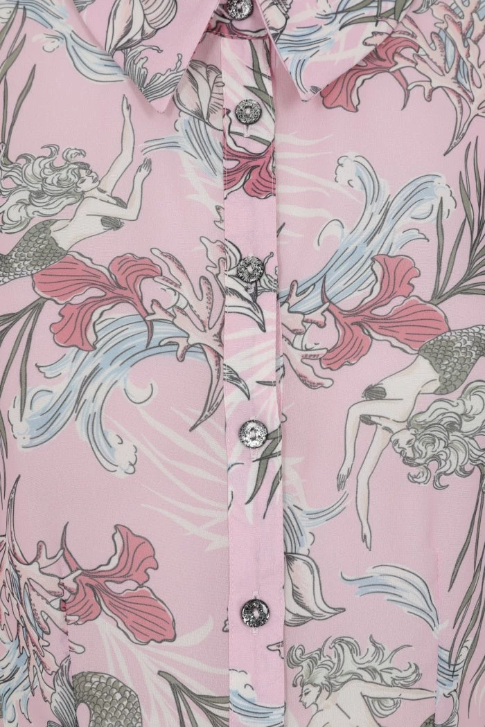 Pink, semi-fitted blouse decorated with mystical mermaids & underwater artworkÂ