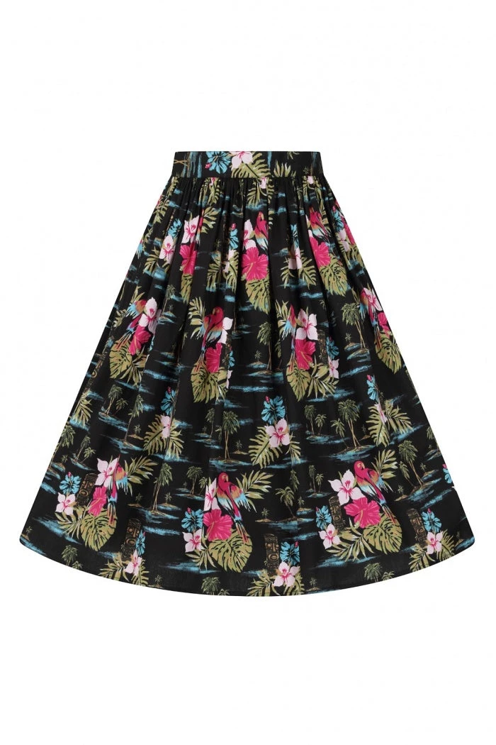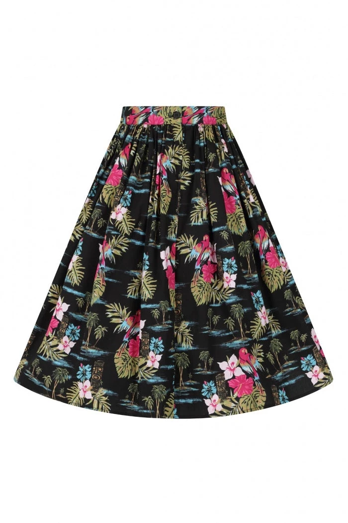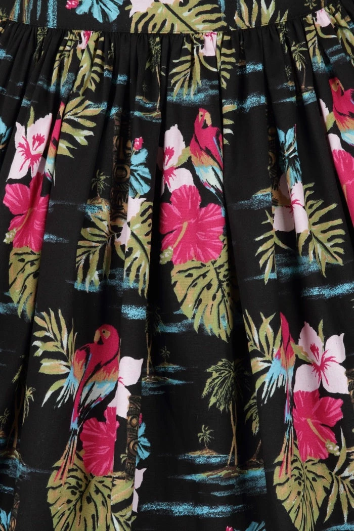 Print is of tiki and parrots on a black background