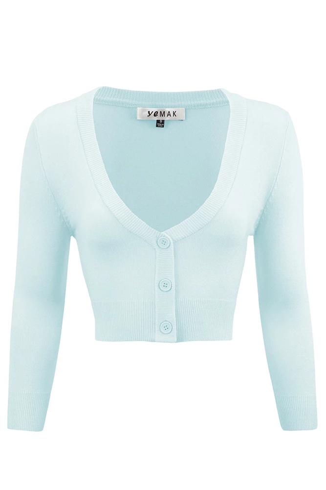 – 14″-15″ Crop Length, 3/4 Sleeves, Button Down, V-Neck Bolero Shrug Knit Cardigan Sweater for Woman that Hits Upper Waist Point.
