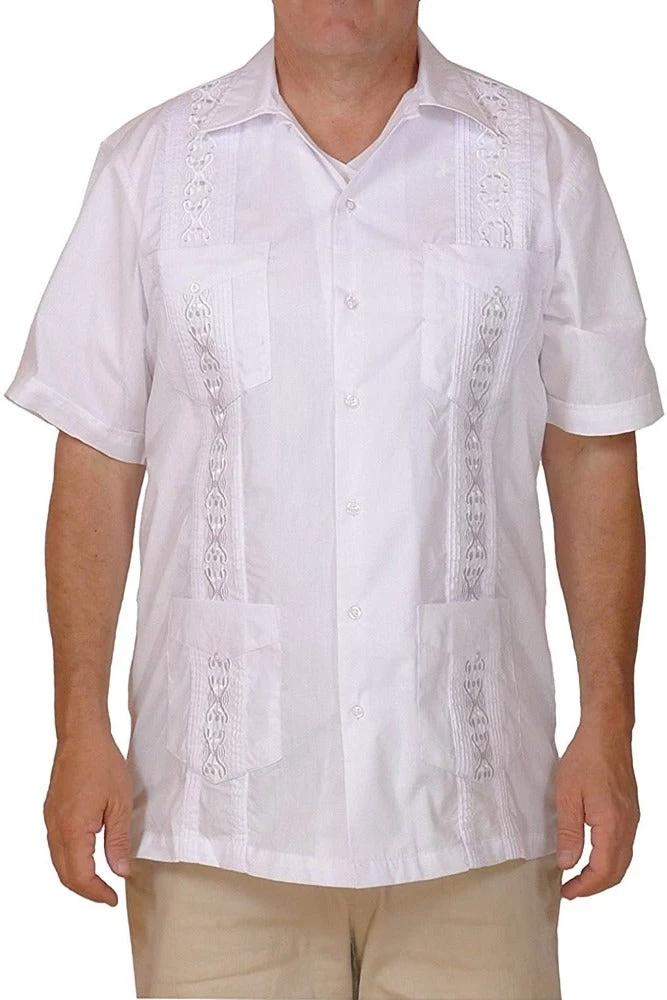 Men’s cuban style shirt with four pocket , embroidery, short sleeves, and buttons.