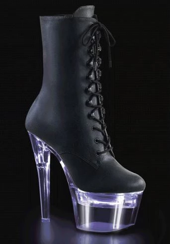 7″ (178mm) Heel, 2 3/4″ (70mm) Platform USB Chargeable LED Light-Up Front Lace-Up Ankle Boot w/ Multiple Static/ Changing Color Options & Light Settings