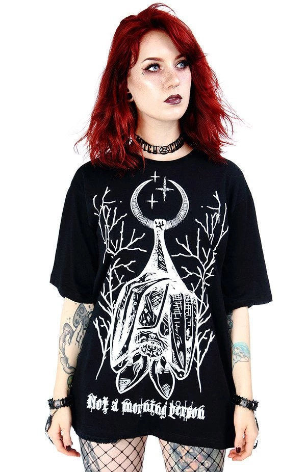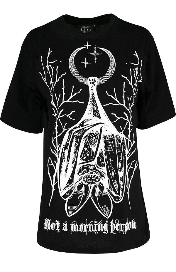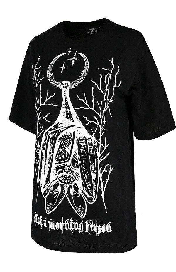 The printing with upside down sleeping bat. You can identify with this bat who is not very eager to wake up early and do the bat-ish things.