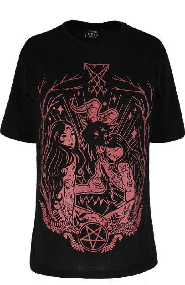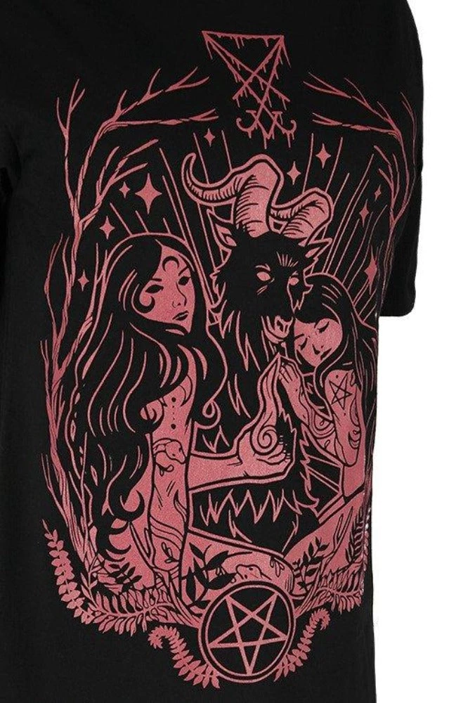 The print shows a goat, the symbol of the devil. It is accompanied by two naked women, one of them tenderly cuttle. All are surrounded by branches, plants, and stars. Over their heads, there is the Lucifer Sigil.