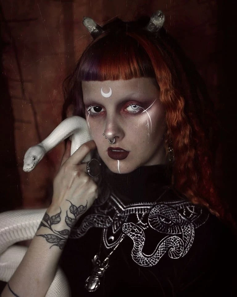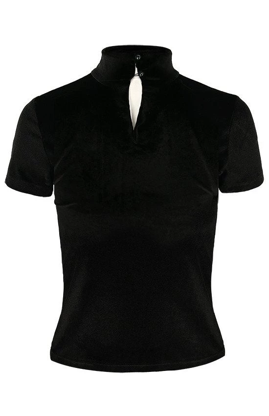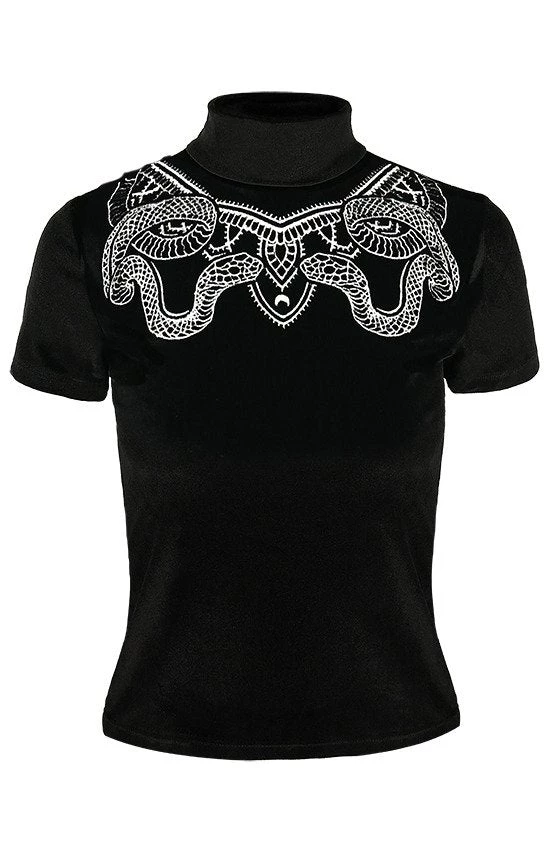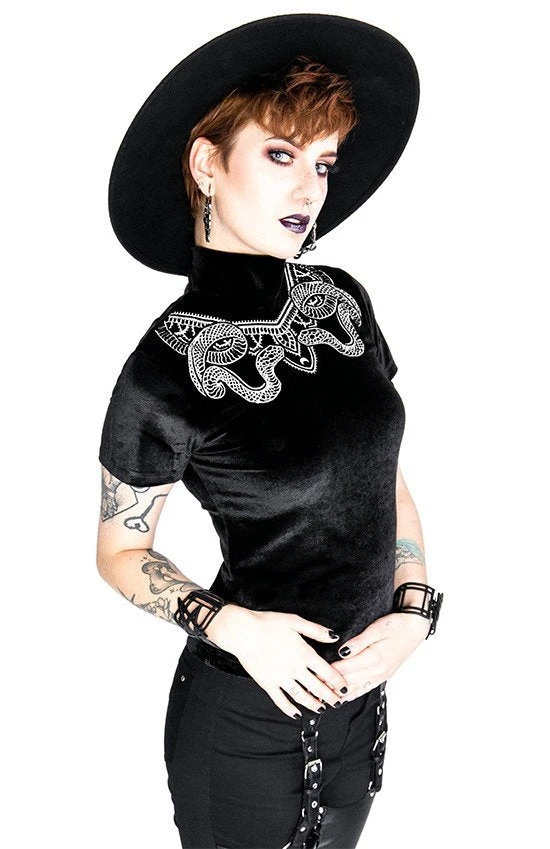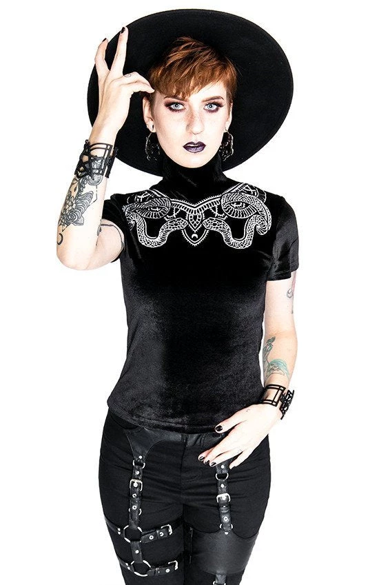 Put a gothic twist in your daily style with this powerful gothic velvet top! Crafted from stretchy, soft velvet. This top is well-fitted with a classic design and two buttons on the back. The front is embellished with bold embroidery of two snakes surrounded by ornaments. Serpents are facing a Crescent Moon symbol. Add this to your wardrobe and better yet, pair this top with our flattering alchemy, a black brim hat, and some Demonias for a witchy goddess look!
