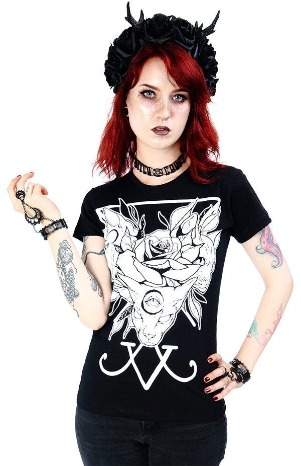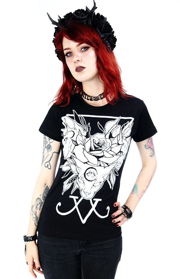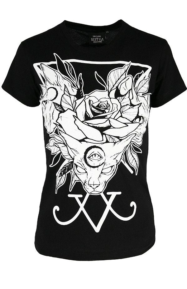 There is three-headed cat with roses and demon sigils in the background. This cat serves no one…