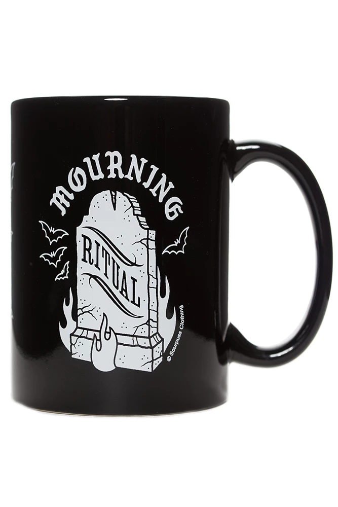 Start a new mourning ritual when you sip your favorite hot cup of coffee or tea from this Sourpuss mug! This ceramic mug is microwave and dishwasher safe.